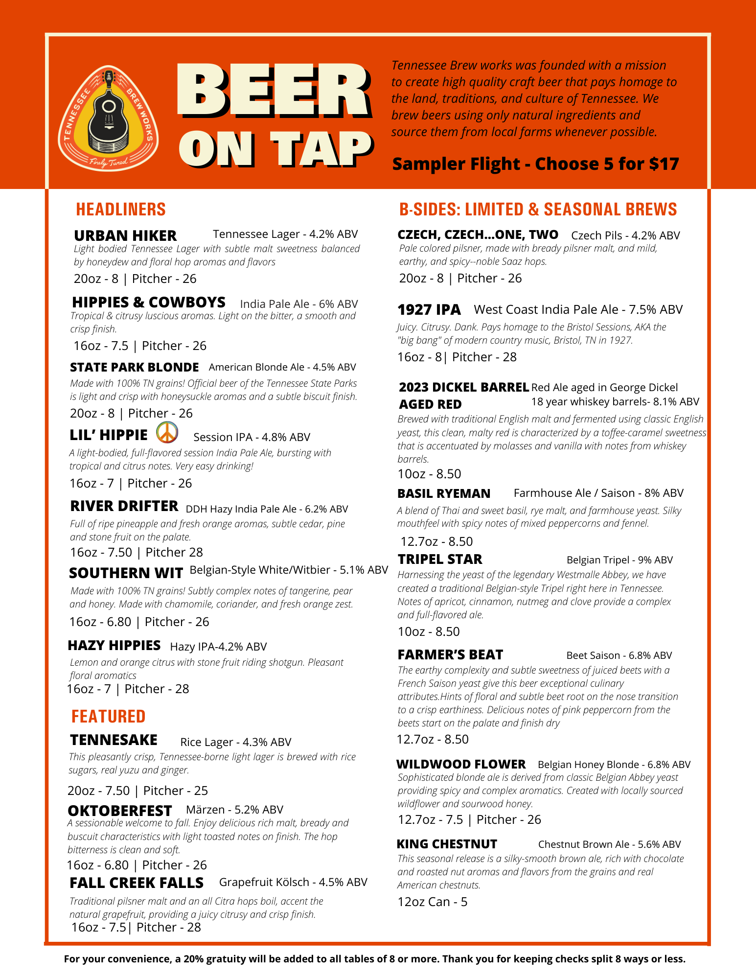 Nashville Beer Menu OUR TAPROOM IS OPEN! Visit us or order online here for food and beer to go. ORDER TO GO View fullsize